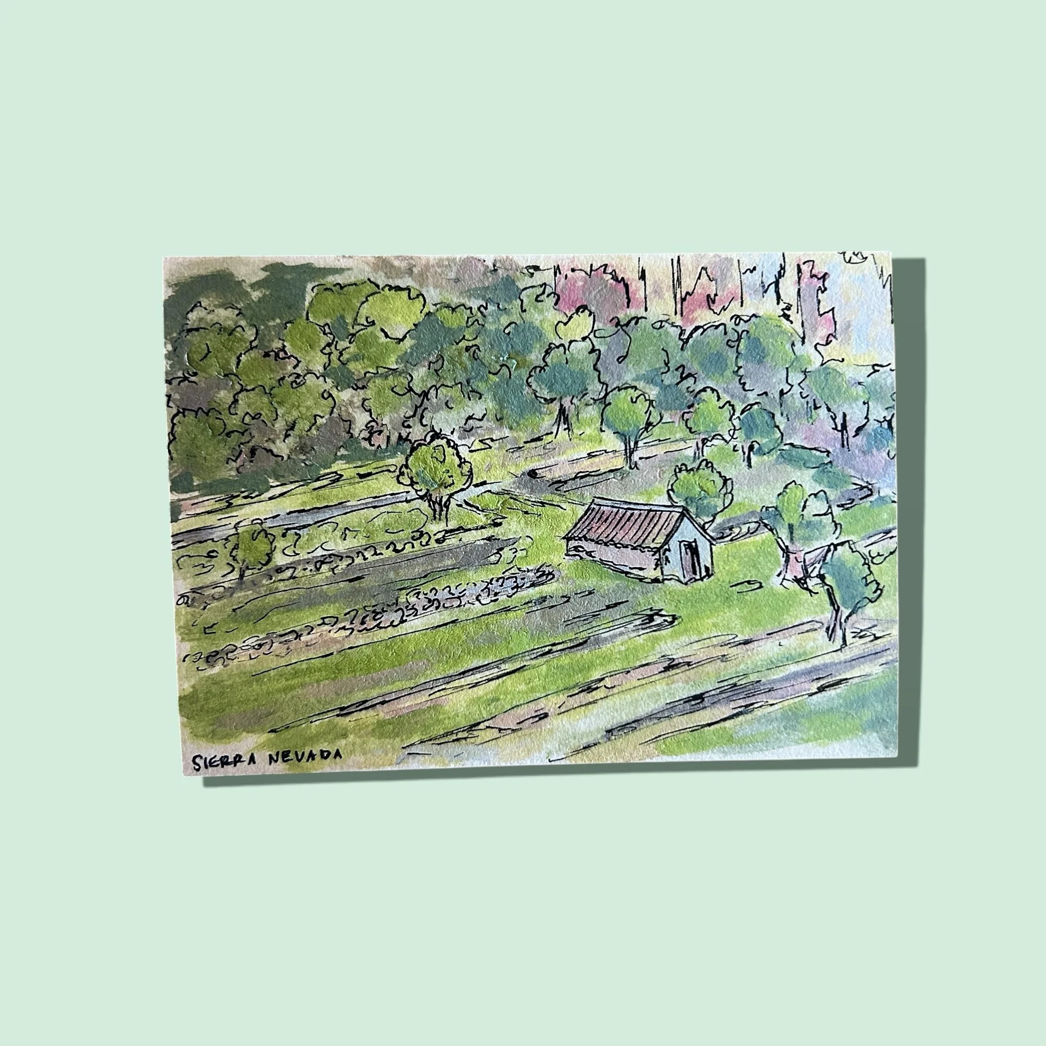 A colorful print of an original painting I created sitting outside in the Sierra Nevada mountains, Spain. Perfect as a travel keepsake, a gift, or a card.