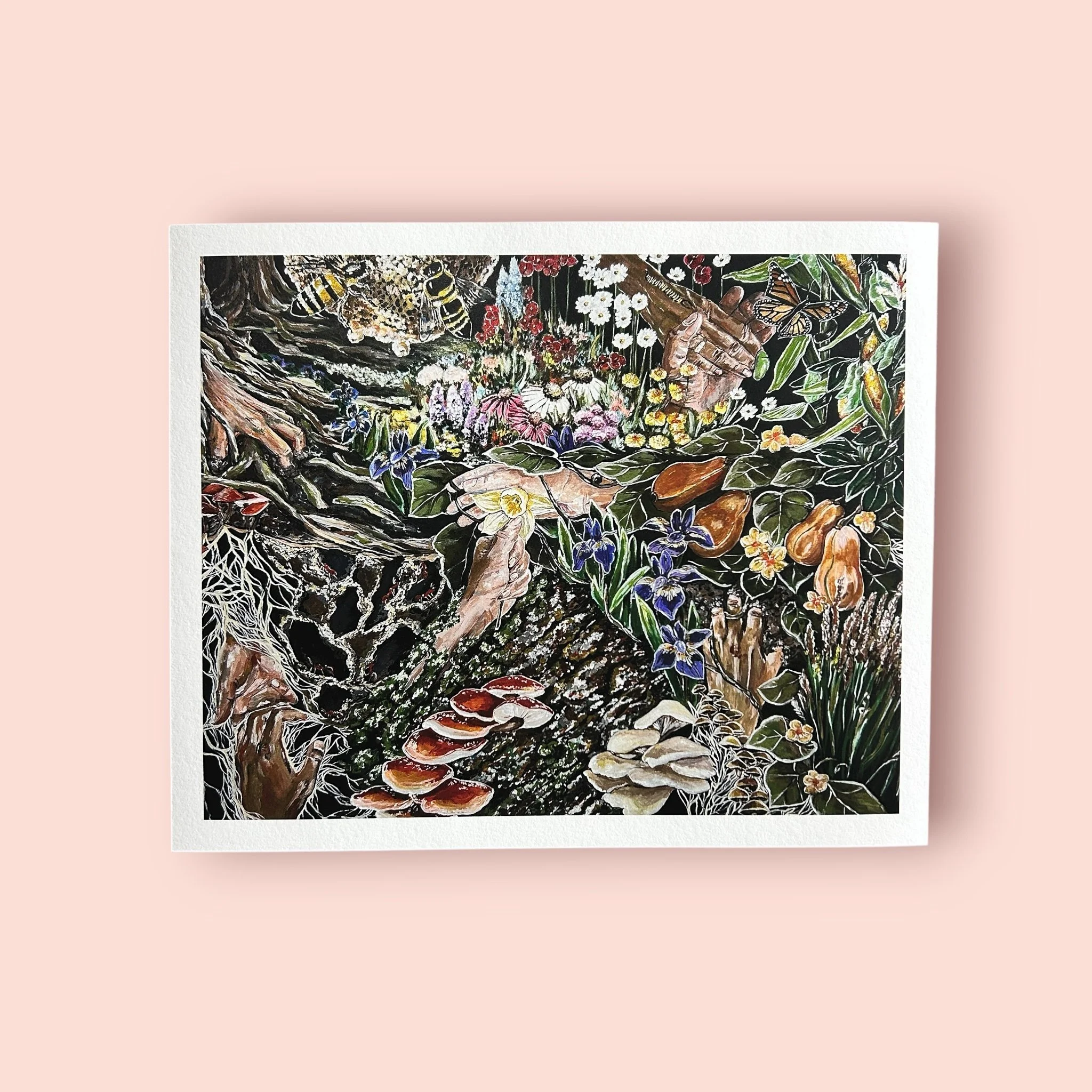 A colorful print of an original painting I created, Return to Our Roots. Return to Our Roots is a visual depiction of the ways that natural ecosystems show us how we can support, celebrate, and lift up one another for the sake of a stronger community and system of aid and mutualism. From ant colonies working together, mycelium connecting and supporting entire ecosystems, and inter planting of beans, squash, and corn to show strength in diversity — Return to Our Roots shows that we have much to learn from our natural environment. The hands intertwined into the roots, flowers, and trees symbolize what we are made of, and that to which we will eventually return. 1/2 inch white border.