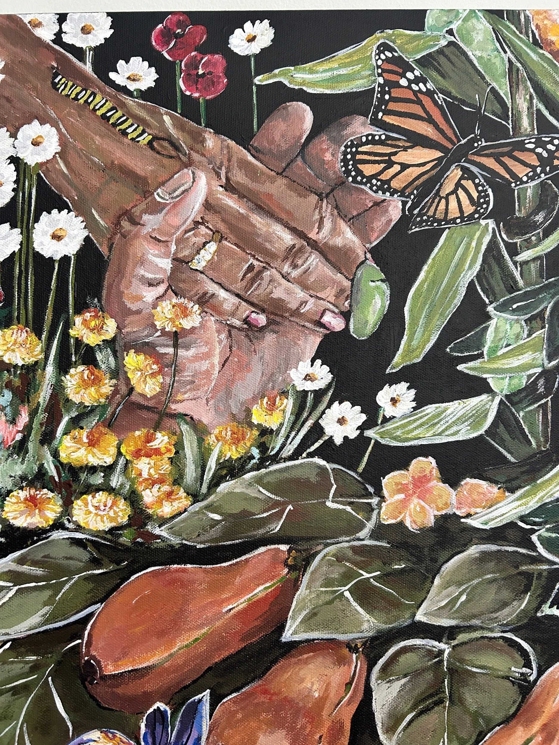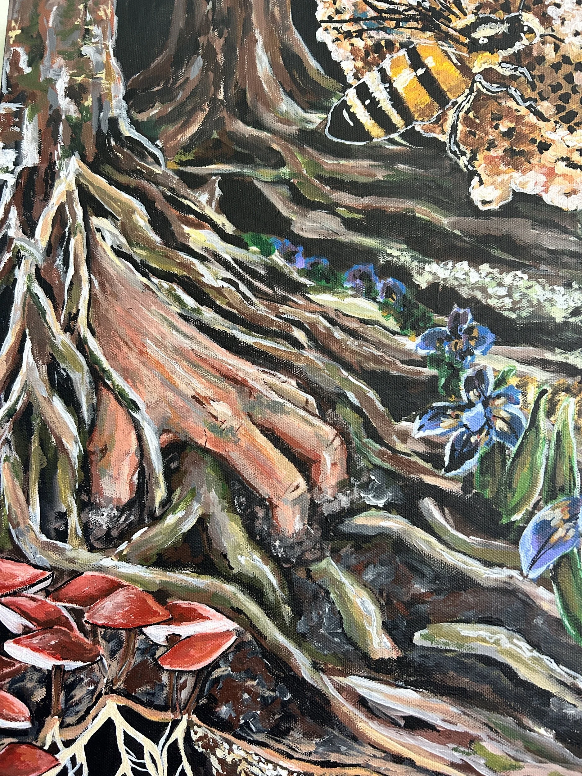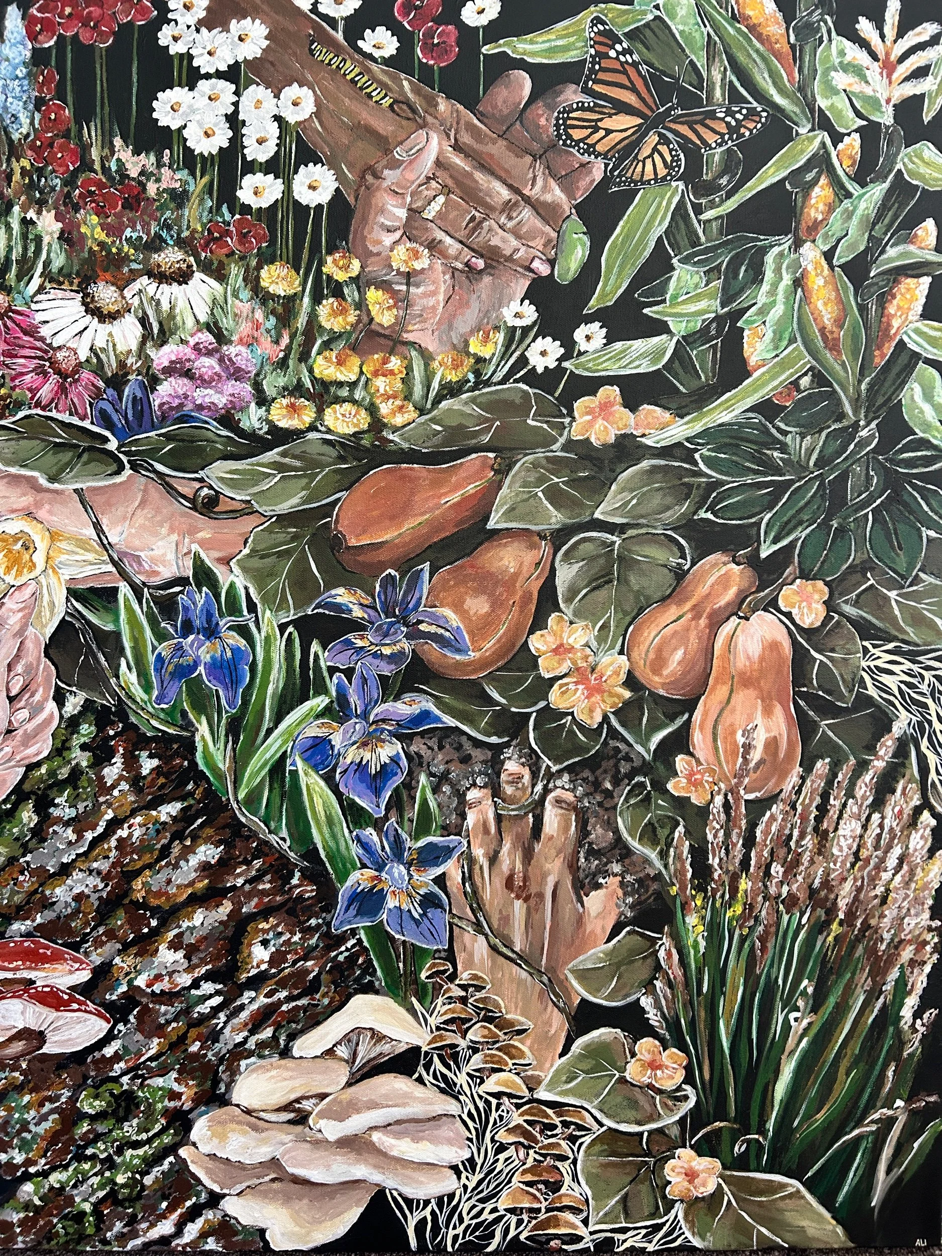 Return to Our Roots is a visual depiction of the ways that natural ecosystems show us how we can support, celebrate, and lift up one another for the sake of a stronger community and system of aid and mutualism. From ant colonies working together, mycelium connecting and supporting entire ecosystems, and inter planting of beans, squash, and corn to show strength in diversity — Return to Our Toots shows that we have much to learn from our natural environment. The hands intertwined into the roots, flowers, and trees symbolize what we are made of, and that to which we will eventually return.