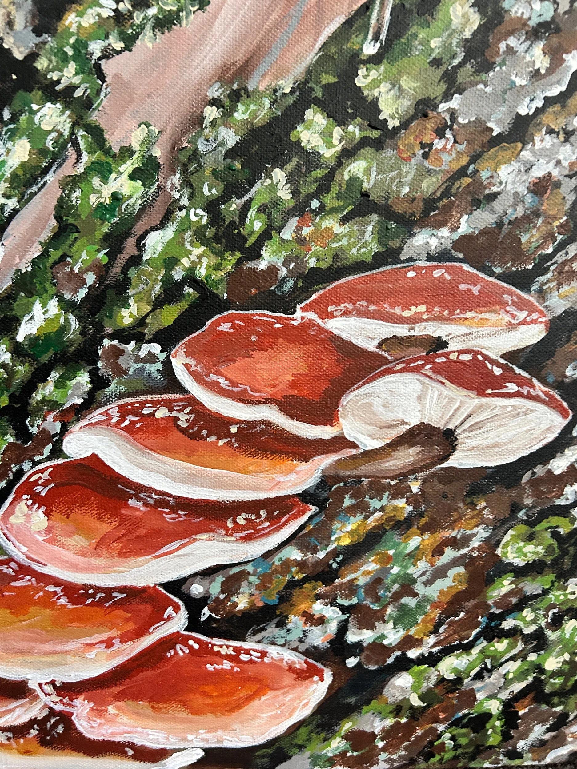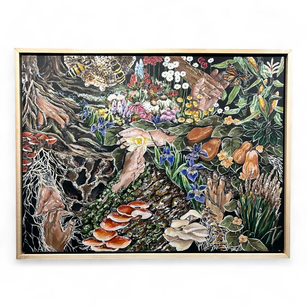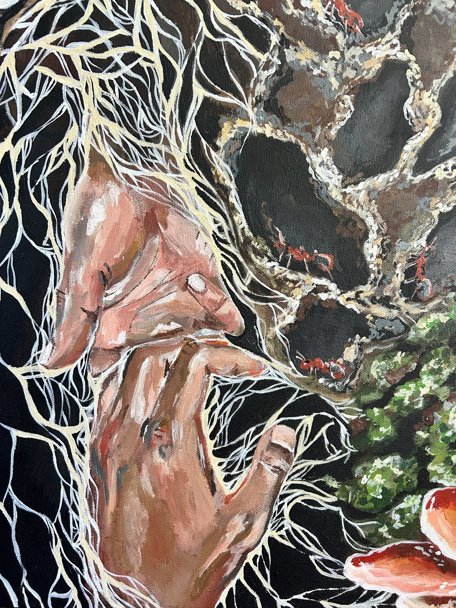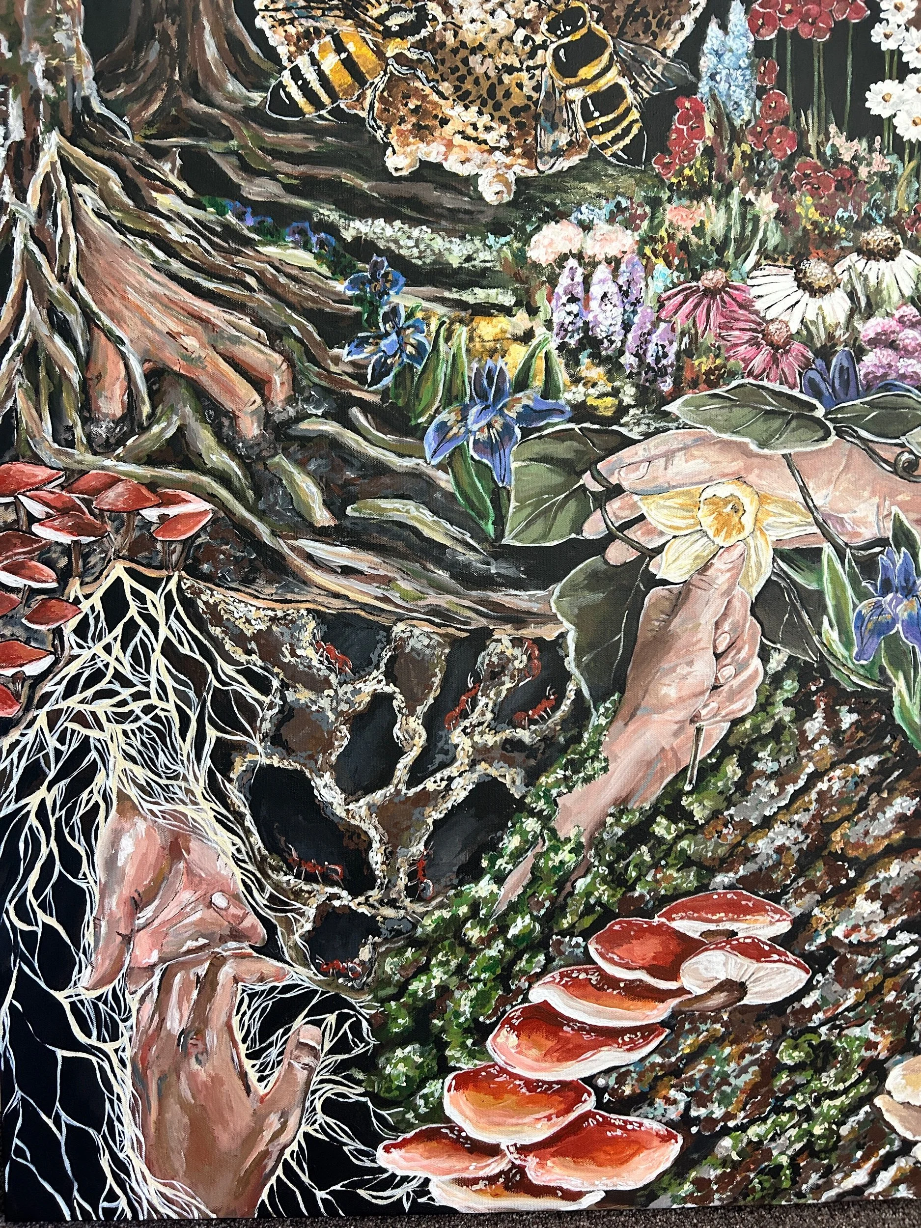 Return to Our Roots is a visual depiction of the ways that natural ecosystems show us how we can support, celebrate, and lift up one another for the sake of a stronger community and system of aid and mutualism. From ant colonies working together, mycelium connecting and supporting entire ecosystems, and inter planting of beans, squash, and corn to show strength in diversity — Return to Our Toots shows that we have much to learn from our natural environment. The hands intertwined into the roots, flowers, and trees symbolize what we are made of, and that to which we will eventually return.