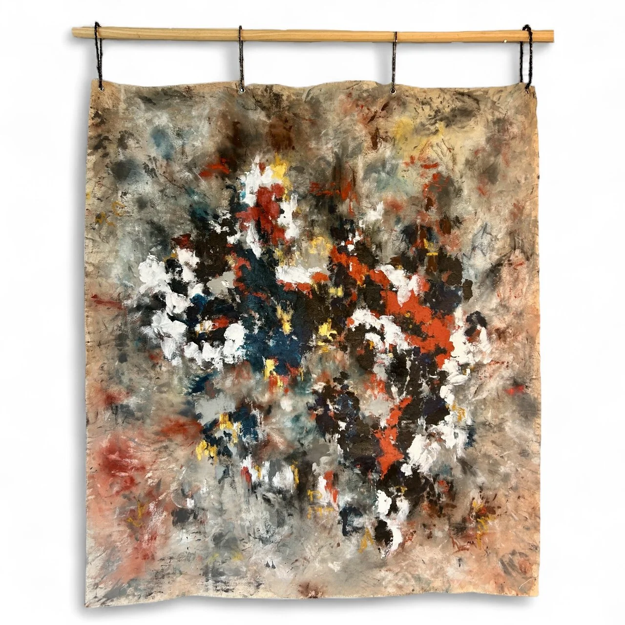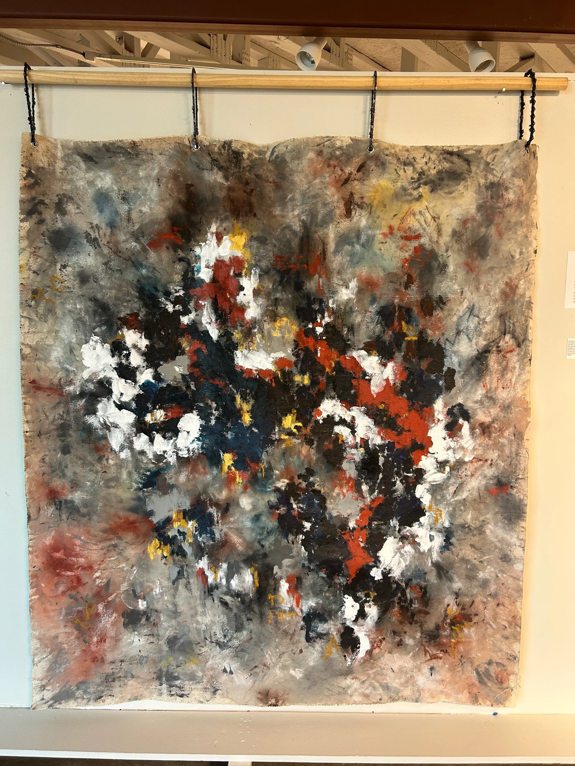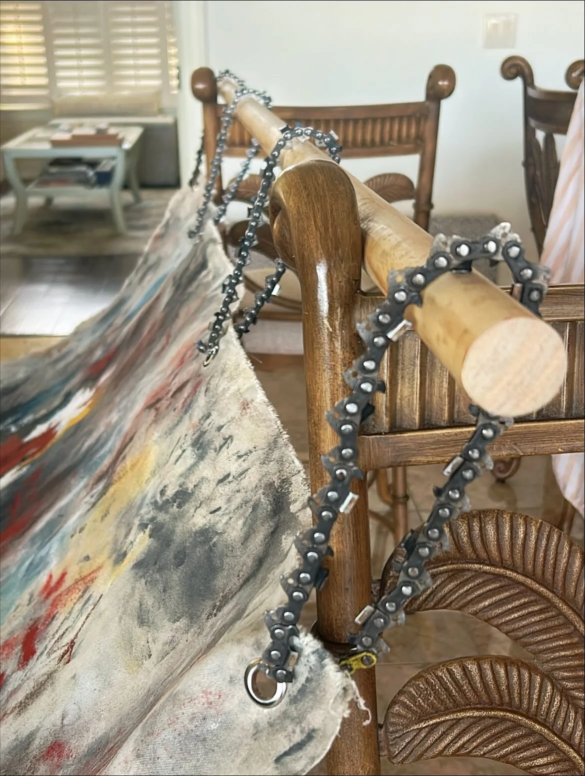 60x68 acrylic, oil stick, charcoal, pastel on raw, unstretched canvas, hung from wood and chainsaw chain